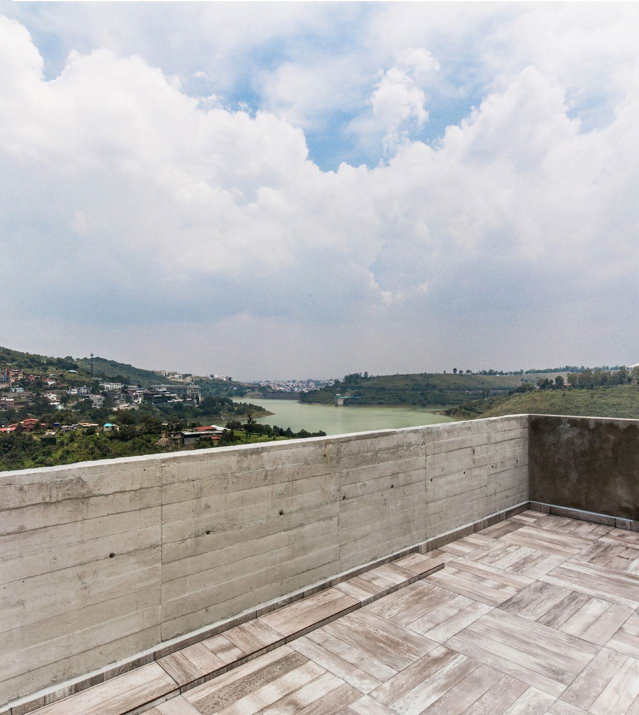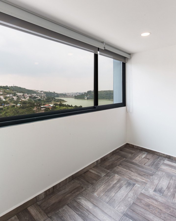 Distribuida en 3 niveles, el nivel de calle recibe e invita al intermedio donde la sala comedor y cocina se integran con el jardín. Así las habitaciones quedan resueltas en el último nivel con vista al jardín y la principal al frente con la Presa Madín rematando en una azotea planteada como roof garden aprovechando la privilegiada ubicación en primera línea del residencial Aqua en Atizapan, Estado de México.