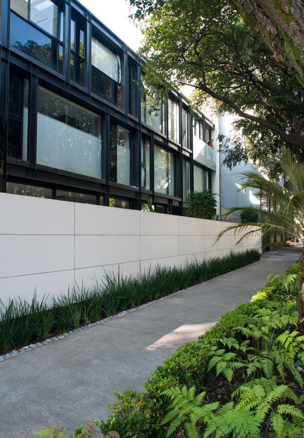 Al reto de resolver los diversos programas se le sumaron las restricciones del uso de suelo que exigían un remetimiento en fachada para poder dar uso al 4to nivel, en el cual la geometría de la cubierta a 30 grados -parcialmente acristalada- solucionó efectivamente la normativa y añadió una espectacular entrada de luz natural a los departamentos.