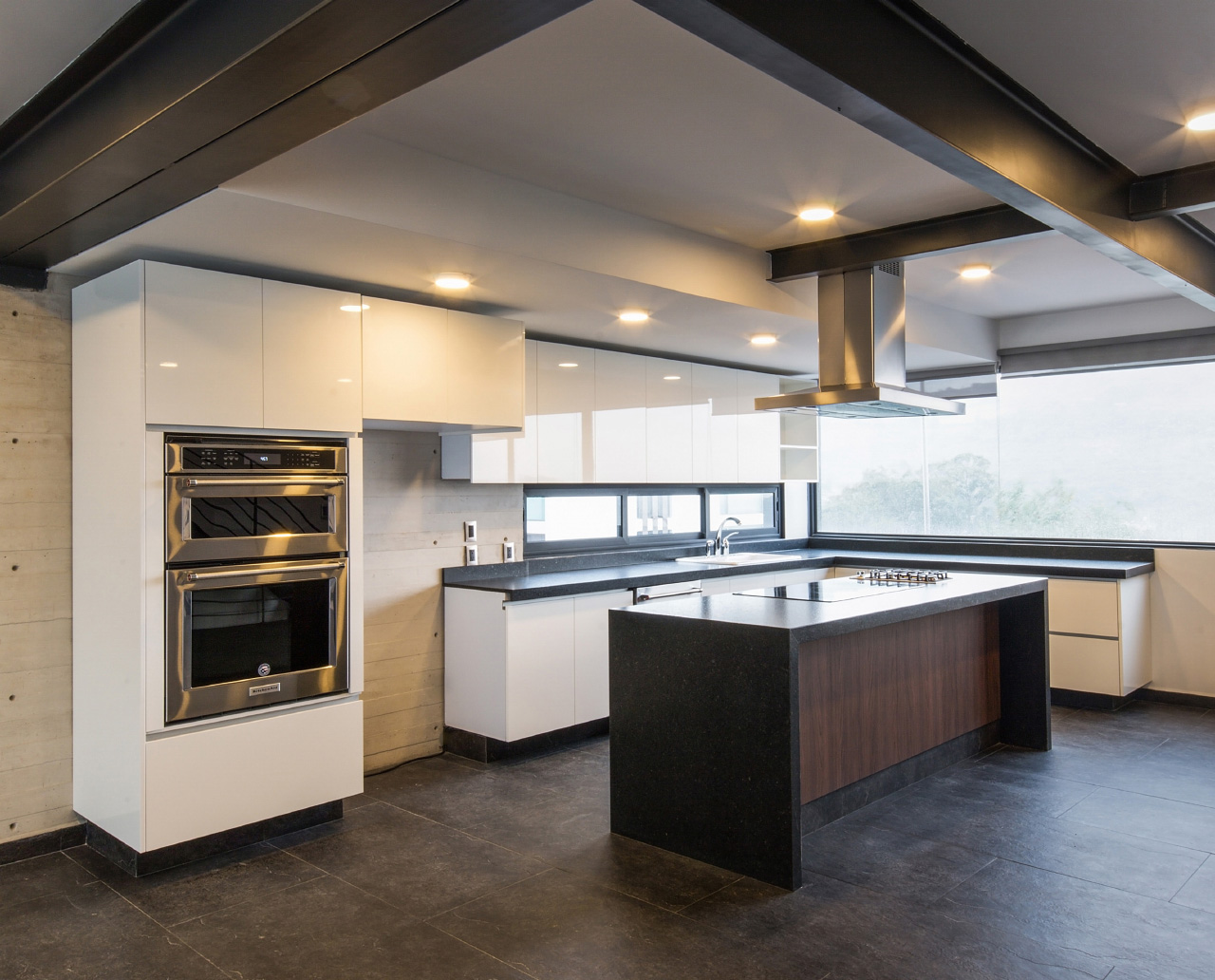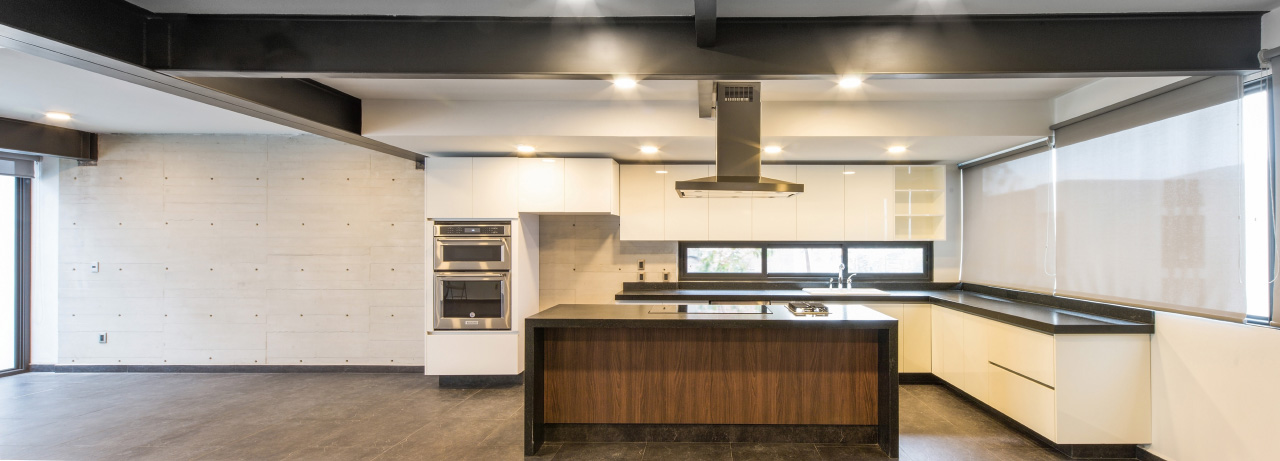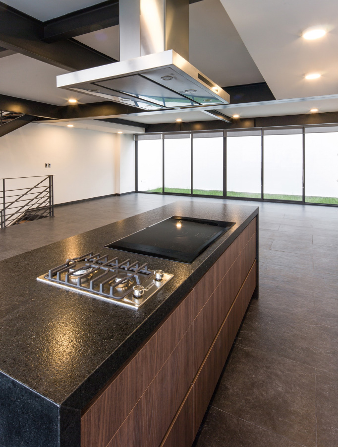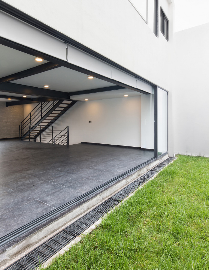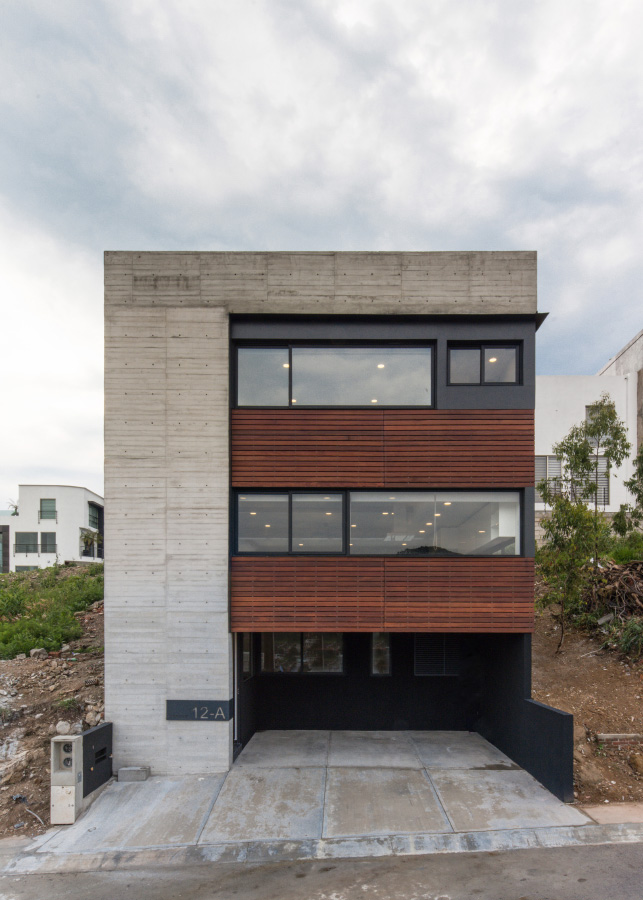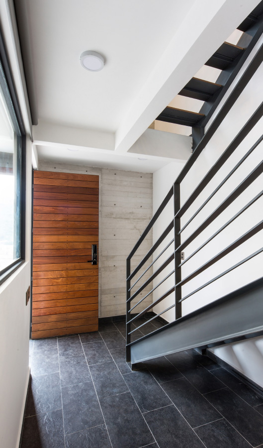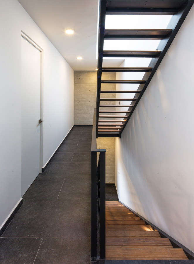 Para obtener la mayor libertad y flexibilidad en el trazo de las plantas se utilizó estructura de acero para iibrar los claros completos entre colindancias laterales lo cual motivó a que la envolvente de concreto aparente se combinara con el acero expuesto y de esta forma darle una estética pura y sobria al volumen total de la casa.
